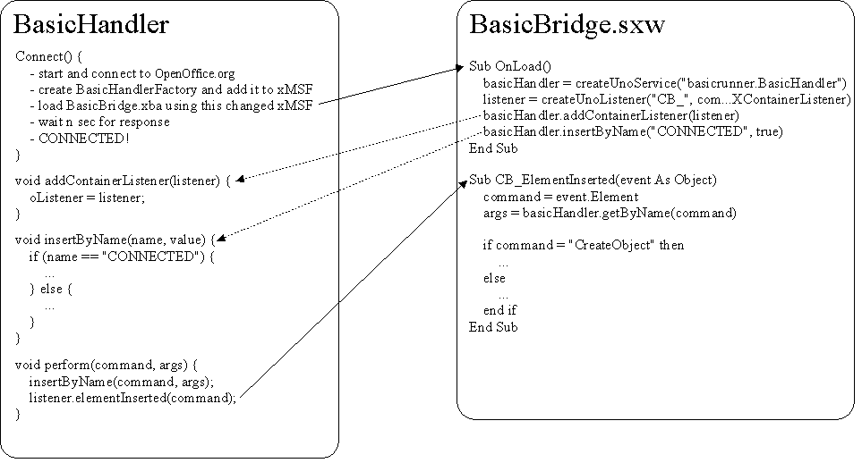 For the communication between Java and Basic, the BasicHandler is used. BasicHandler has its own factory called BasicHandlerProvider, which inserts it into the MultiServiceFactory of the Office. The Basic scripts in BasicBridge.sxw can create an instance from the MultiServiceFactory directly and call methods there, thus enabling the information flow from Basic to Java.